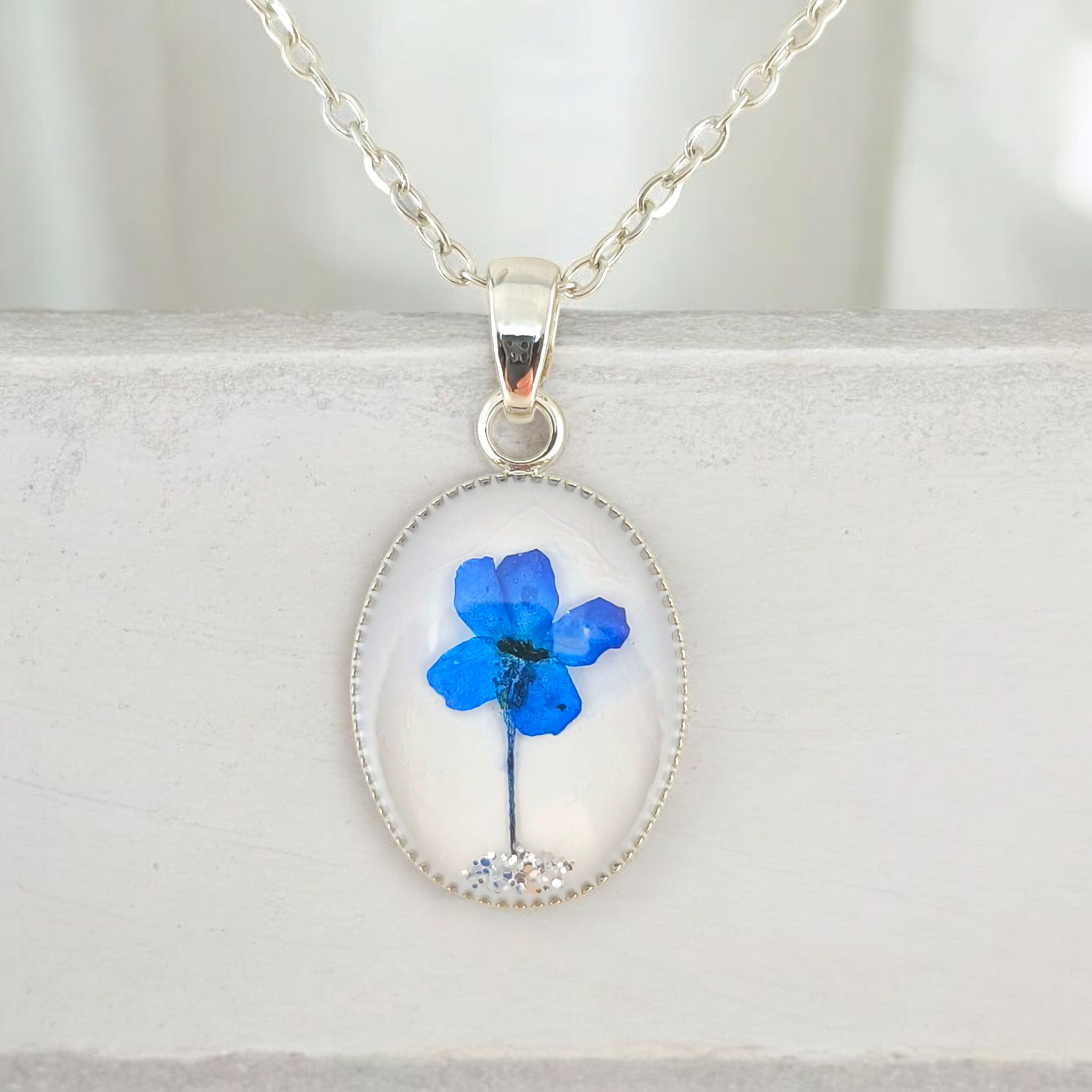 - Naszyjnik z prawdziwą niezapominajką zatopioną w przejrzystej żywicy.